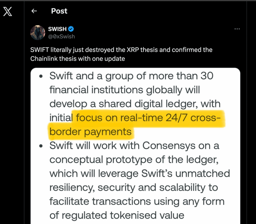 - Другой комментатор добавил это движение Swift«Он буквально уничтожил тезис XRP».