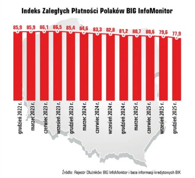 Индекс просроченных платежей поляков (ИЗПП), разработанный BIG InfoMonitor и BIK, также демонстрирует явное улучшение. Последние показания индикатора показывают, что количество должников на 1000 взрослых жителей является самым низким с 2017 года. По итогам 2025 года показатель составлял 77,9 пункта.