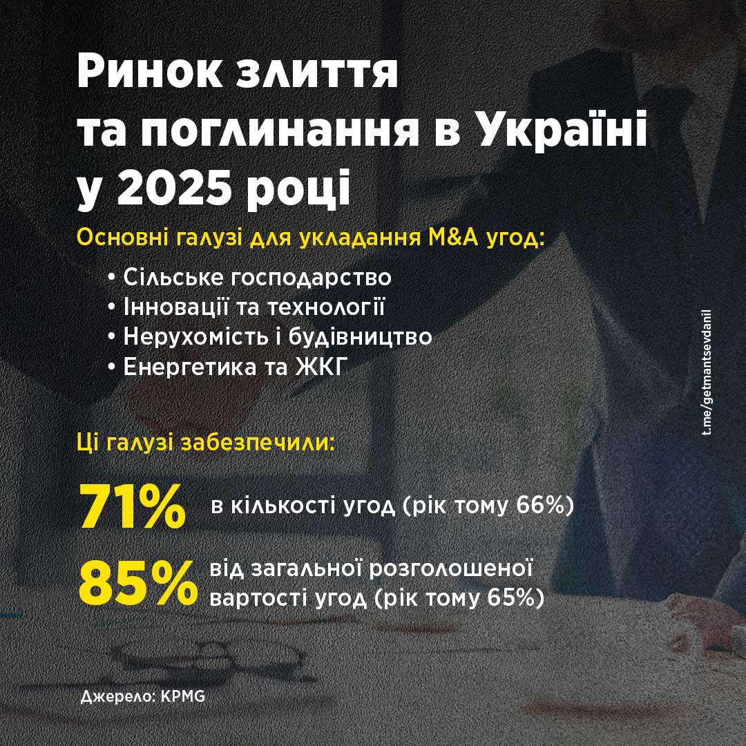 В течение 2025 года на рынке слияний и поглощений в Украине было проведено 63 соглашения, стоимость каждого из них — более 5 млн. дол. Это на 26% больше, чем в 2024 году. Тогда в Украине заключили 50 M&A соглашений.