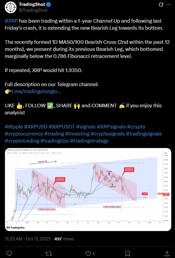 Мгновением позже свой прогноз представил еще один уважаемый аналитик криптовалютного рынка — TradingShot. По оценкам эксперта, цена XRP движется в восходящем канале с конца ноября 2024 года, но недавно вступила во вторую фазу снижения после распродажи на прошлой неделе. Согласно выводам TradingShot, Ripple в настоящее время движется к резкому падению до 1,93 доллара США.