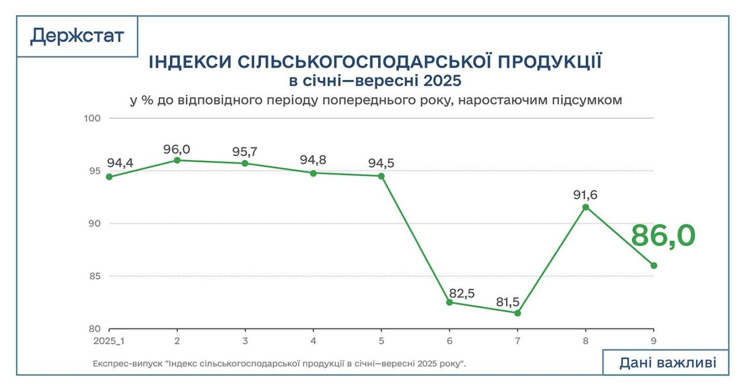 Согласно предоставленным данным, общий индекс продукции сельского хозяйства в Украине составил 86,0% от показателя за январь-сентябрь 2024 года.