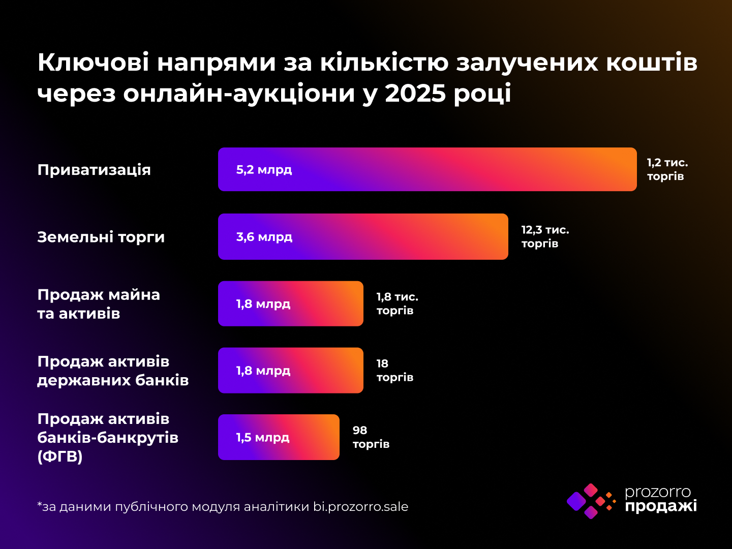 Государственная электронная торговая система «Прозорро.Продажи» подвела итоги своей деятельности за 2025 год. За год успешно проведено почти 28,7 тыс. онлайн-аукционов, которые принесли государству и населению более 16,2 млрд грн.