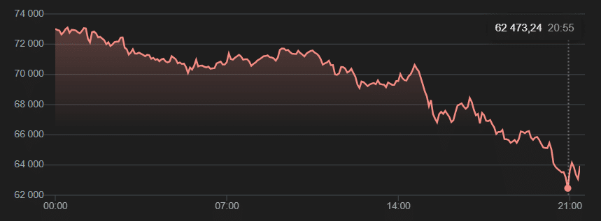 Трейдер наряду с длинными позициями по драгоценным металлам решил сыграть на стороне покупателей крупнейшую криптовалюту в мире BTC. Вероятно, он увидел признаки истощения продавцов на графике Биткойна после гигантской волны продаж, которая длилась сегодня весь день, даже ниже исторического максимума предыдущего бычьего рынка (около 69 000 долларов США за токен). Заорский решил открыть длинный контракт на сумму около 65 400 долларов США, и… к сожалению, бит продолжал падать, в какой-то момент достигнув отметки 62 000 долларов США. долларов США за единицу криптовалюты.