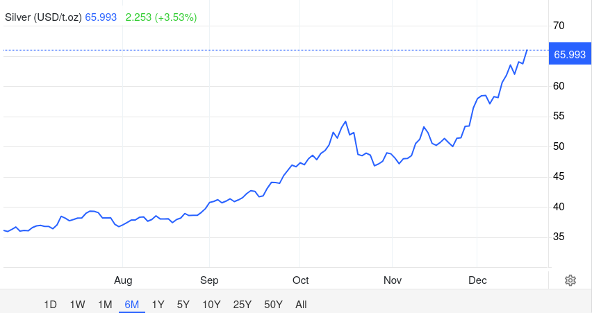Серебро стало бесспорным лидером рынка. После достижения пика цена скорректировалась до $65,94 (+3,4% за сессию). С начала года цена на металл выросла на впечатляющие 128%.