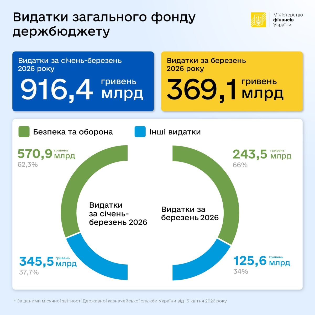 Расходы общего фонда государственного бюджета на безопасность и оборону за январь — март 2026 составили 570,9 млрд грн, или 62,3% от всех расходов общего фонда.
