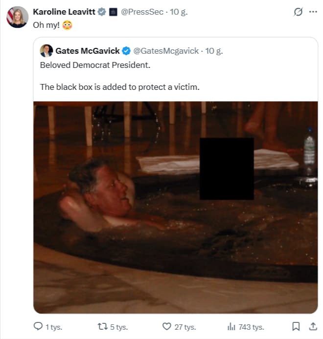Информационная стратегия Министерства юстиции была сосредоточена на разоблачении связей демократов с сетью Эпштейна. Пресс-секретарь Белого дома Кэролайн Ливитт красноречиво прокомментировала фотографии Клинтон в своих постах на X, предположив, что общественность наконец-то узнает правду об оппозиционных элитах.