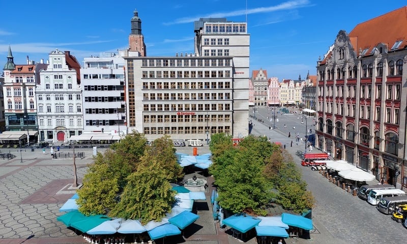 Летом реконструкция модернистского здания, стоящего на углу рыночной площади, и Solny Square достигла темпа. 9-этажный фасад покрыт серой сеткой, нижней части фасада-соль, покрытый каркасами. Механические молотки пошли на спину. Рабочие поймают плитки из клинкера вокруг дверных отверстий.