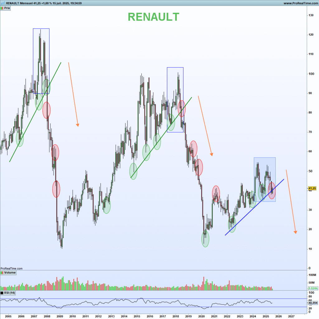 Renault, французский автомобильный гигант, сегодня погрузился почти на 20%. Это последствия решения компании сократить финансовые прогнозы на 2025 год и внезапное изменение в должности президента. Немедленный эффект. Цитаты упали на самый низкий уровень в течение года. Эта сессия является худшей для компании после кризиса Covid-19 в марте 2020 года.