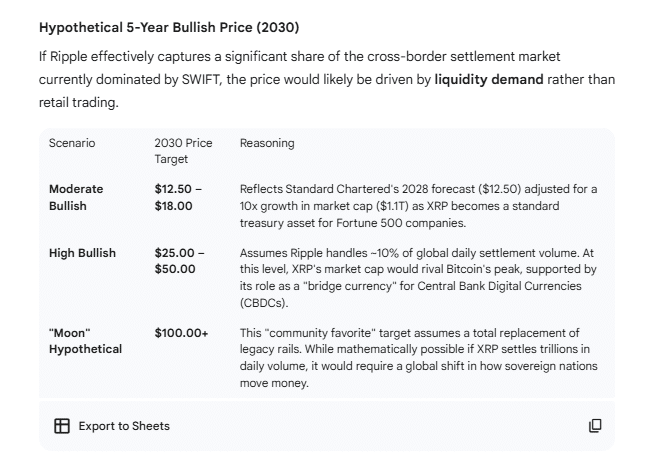 Исходя из текущей цены XRP в $1,96, Gemini сформулировала свой прогноз. В основном основан на глобальной ликвидности, а не на краткосрочных спекуляциях. В умеренно оптимистичном пятилетнем сценарии цена XRP может варьироваться от $12,50 до $18,00. Это соответствует прогнозу Standard Chartered на 2028 год. Прогноз банка — $12,50. Он предполагает растущую популярность среди крупных корпораций и рыночную капитализацию почти в 1,1 триллиона долларов США.