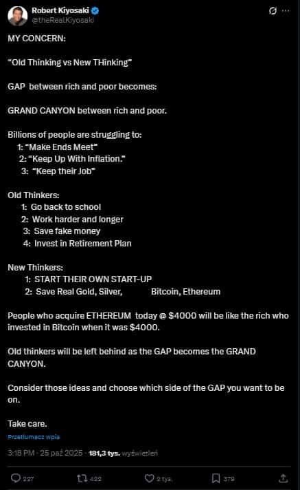 Разрыв между традиционным и новым образом мышления уже не является небольшим разрывом — он перерастает в гигантский разрыв. Окажетесь ли вы на той или иной стороне, зависит не от случайных обстоятельств, а от решений, которые вы принимаете сегодня. Наблюдения Кийосаки особенно важны сегодня, потому что важно то, как новые поколения людей делают с деньгами. Также за позицию такой страны, как Польша. Финансовая осведомленность и воля действовать — основа свободы.