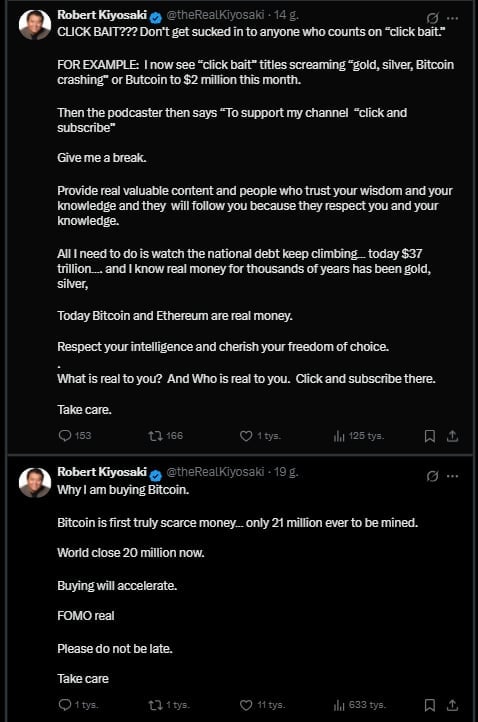 Напомним, что Роберт Кийосаки — писатель, инвестор и один из немногих, кто сочетает мир финансового образования с философией свободы. Его можно назвать популяризатором инвестирования. Теперь он ясно говорит: он покупает биткойны. Не потому, что он ожидает быстрой прибыли, а потому, что видит в этом что-то, что напоминает ему золото и серебро… Оба актива основаны на принципе дефицитности предложения, а не на обещаниях людей в костюмах. Вот последние заявления Кийосаки о платформе X.
