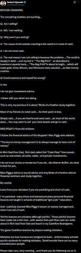 Кийосаки уже много лет говорит, что не любит действовать под принуждением. Тем более под давлением временного падения ликвидности. Именно здесь проявляется разница между теми, кто должен избавиться от активов, и теми, кто может подождать, пока уляжется пыль. Когда вам срочно не нужны деньги, вы не продаете золото, биткойны или недвижимость только потому, что рынок запаниковал.