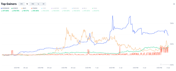 Среди них есть Dogebase, Hosico, WLFI и Star10, которые зафиксировали увеличение более чем на 100% всего за одну неделю. В частности, Dogebase зафиксировал увеличение на 429%, Hosico на 218%, WLFI на 191%и Star10 на 182%, как вы можете видеть на Coinmarketcap.