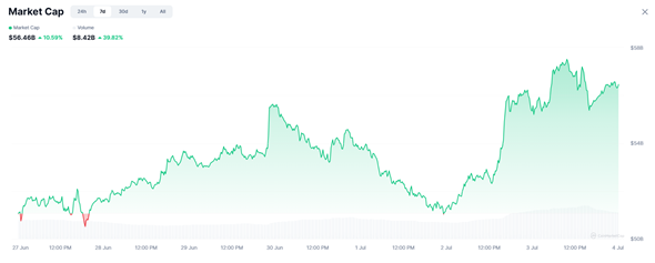 Рыночная капитализация Memecoin увеличилась на 10,59% всего за одну неделю. Это отражает значительное улучшение их ситуации по сравнению с предыдущими днями. 27 июня общая рыночная капитализация этого сегмента криптовалюты составила 51 миллиард долларов США. Однако до 3 июля он достиг 56,46 миллиарда долларов США. Это означает значительное процентное увеличение.