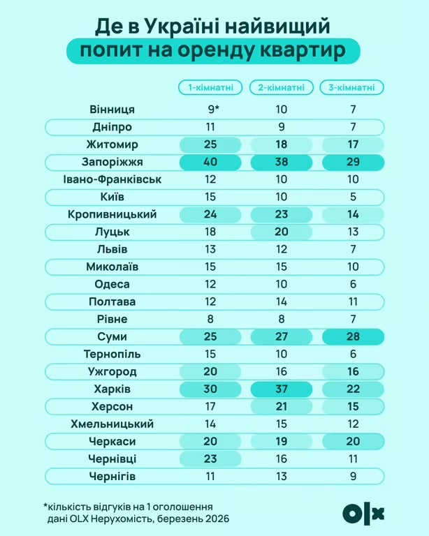 Настоящим лидером по интенсивности запросов неожиданно стало Запорожье. Здесь на одно объявление о сдаче однокомнатной квартиры приходится почти 40 реальных отзывов – это вчетверо больше, чем мы видели прошлой весной.