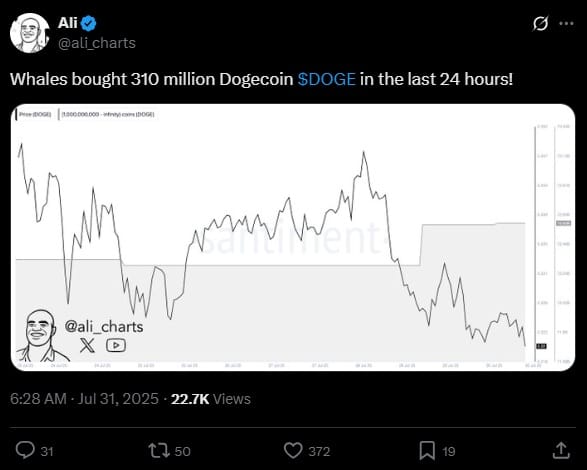 Это не выглядит хорошо, но есть много признаков того, что у крупных владельцев есть другое чувство. Али Мартинес сообщил в одной из последних записей на x Это только в последний день июльских китов выиграл около 310 дог с рынка. Несколько дней назад они купили 130 миллионов штук этой криптовалюты в аналогичном диапазоне. Это означает, что за короткое время крупные владельцы приобрели почти полмиллиона Dogecoin. Данные поступают из Santiment — авторитетной аналитической платформы.