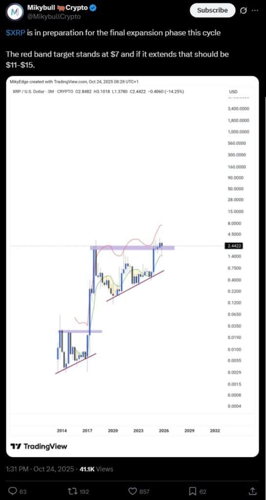 После того, как XRP значительно улучшил свои рейтинги, сразу же появились прогнозы, которые предполагали, что токен только начинает очередное ралли. Несколько дней назад Mikybull Crypto, один из самых популярных экспертов по криптовалютам, подсчитал, что если токен останется в восходящем канале в последующие дни, это может пойти по пути, который приведет к 7-15 долларам за токен.