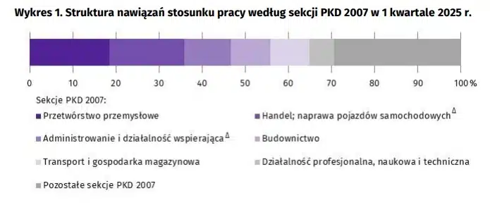 Подробные данные Главного статистического управления показали, что в рассматриваемый период их было 612,4 тысячи. установление трудовых отношений, из них 45,1% касались женщин. Больше всего подключений было зафиксировано в Варшавском столичном регионе (19,6% от общего числа). Меньше всего подключений зафиксировано в Свентокшиском регионе (1,9% от общего числа). Среди всех обращений 11,2% касались иностранцев.