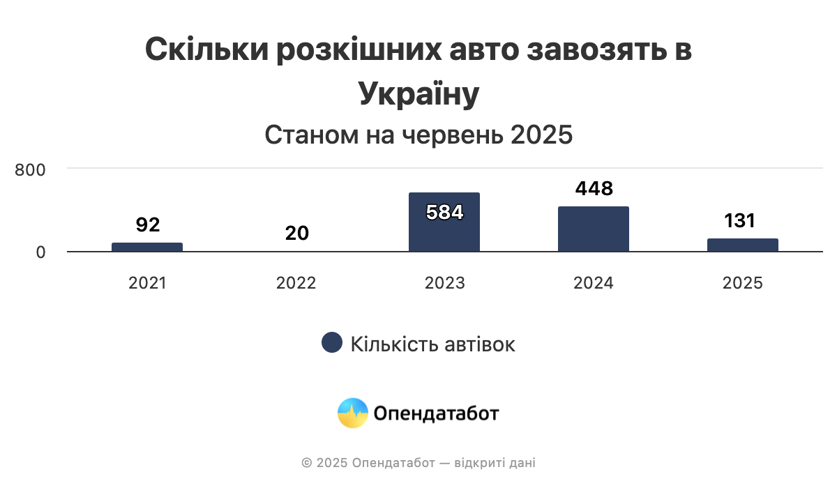 131 «Роскошный» автомобиль сумел привезти украинцев из -за рубежа в течение 5 месяцев 2025 года. Это в 3,4 раза меньше, чем 5 месяцев в прошлом году — 448 автомобилей. Однако по сравнению с 2021 годом дорогие автомобили увеличились на 42%. Это указано в данных OpenAtable.