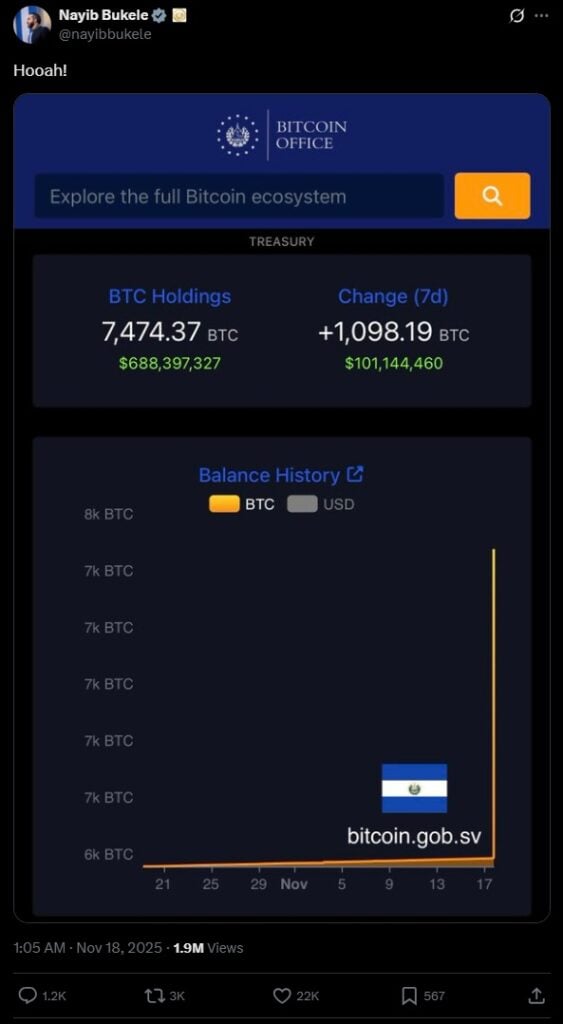 Букеле, похоже, придерживается этой стратегии: последние данные свидетельствуют о рекордных покупках. В начале недели только за один день Сальвадор купил 1000 BTC. Это крупнейшая транзакция с тех пор, как Биткойн был принят в качестве законного платежного средства. Эта сделка увеличила общие резервы государства до 7 474 BTC на сумму примерно 676 миллионов долларов.