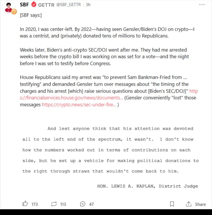 Бэнкман-Фрид, который в настоящее время отбывает 25-летний тюремный срок по множеству обвинений в мошенничестве и заговоре в связи с кражей миллиардов долларов у клиентов FTX, поделился своими мыслями в сообщении GETTR, предположительно продиктованном другу, поскольку он не может публиковать сообщения самостоятельно.