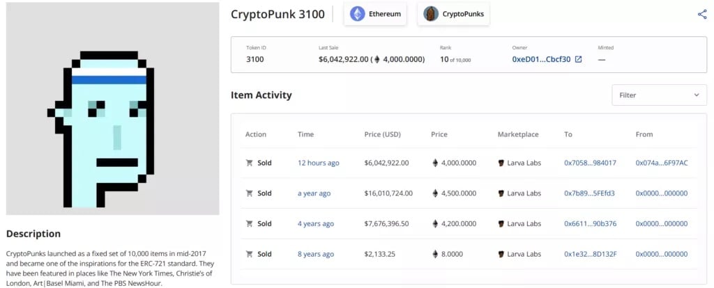 Одна из редких копий серии Cryptopunk #3100 прошла нового владельца за 4000 ETH (~ 6 миллионов долларов). В марте 2024 года тот же NFT был куплен за 4500 ETH (~ 16 миллионов долларов).