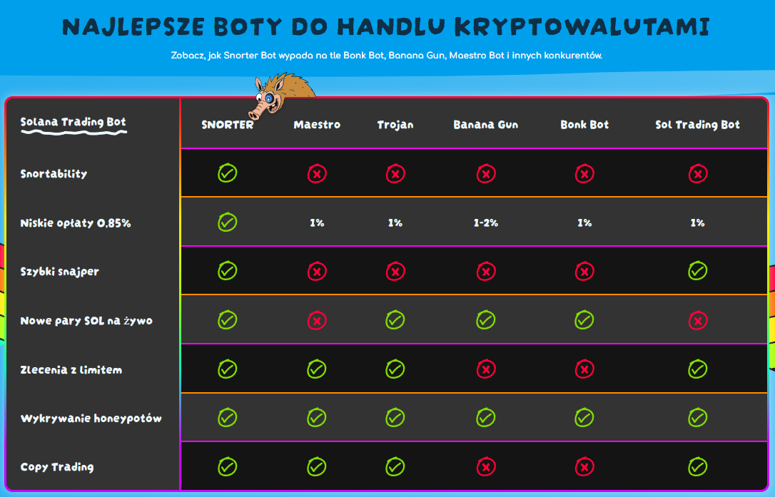 | Функция | Стором (Солана) | Банановый пистолет (Ethereum) | Маэстро бот | Типичный браузер бот |