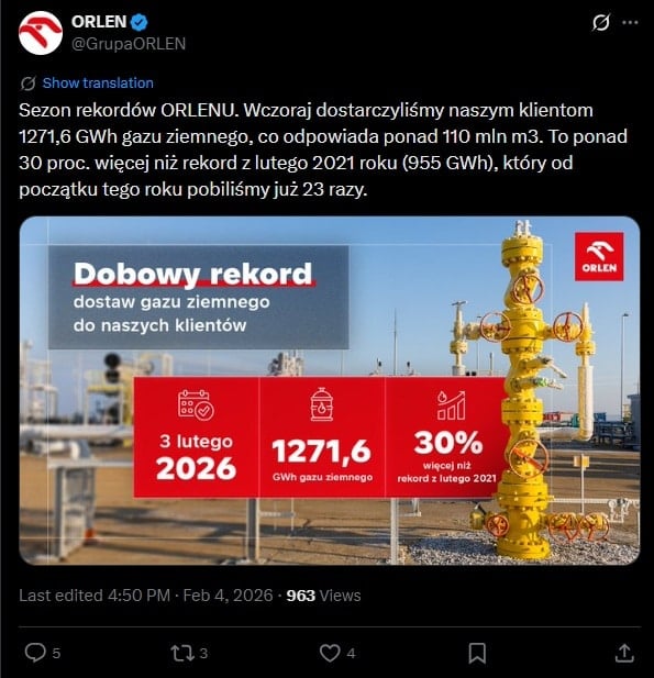 Похоже, что если погода сохранится, февраль может стать месяцем еще большего потребления газа. Во вторник, 3 февраля, «Орлен» за сутки поставил 110 миллионов кубометров газа. Это самый высокий ежедневный спрос в истории, который на целых 30% превысил предыдущий рекордный уровень в 2021 году.