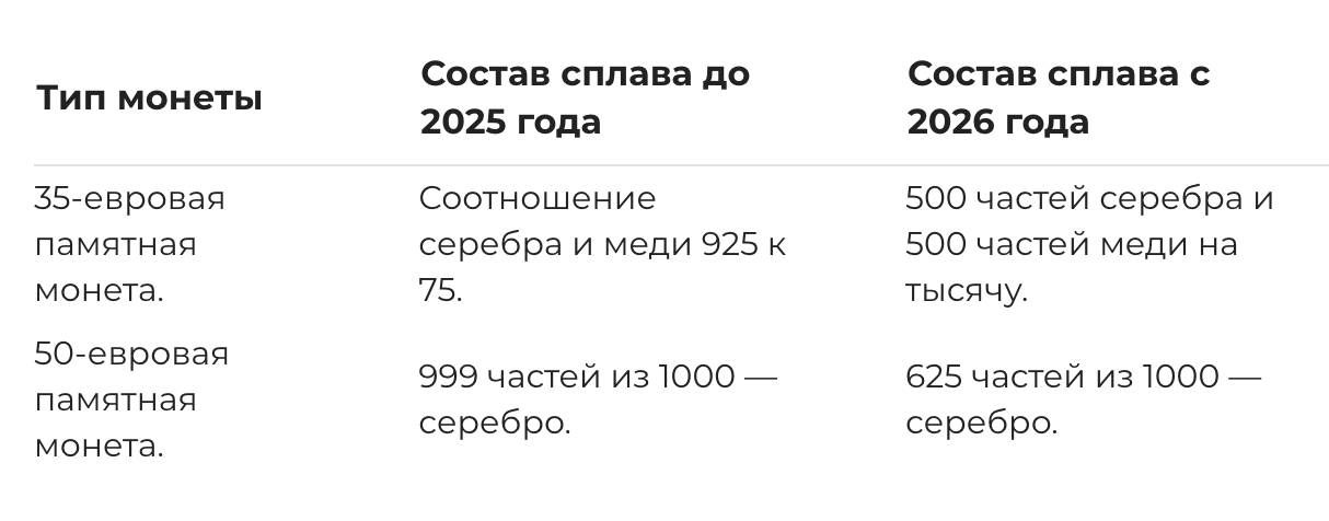 Новые 35-евровые монеты теперь производят не из стерлингового серебра, как раньше. Их вес – 17 граммов. А 50-евровые монеты больше не будут из чистого серебра. Их вес – 21 грамм. Обе монеты в обычной чекане стали на один грамм легче из-за того, что серебра у них меньше.