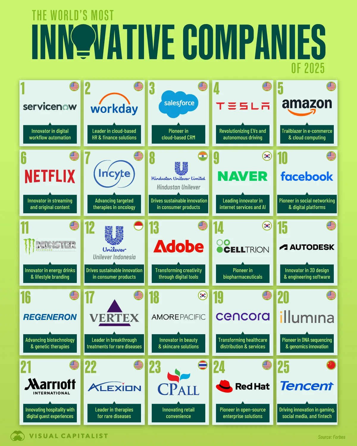 Американская технологическая компания ServiceNow, специализирующаяся на автоматизации цифровых рабочих процессов, была названа самой инновационной компанией мира 2025 года по версии Forbes. В ежегодном рейтинге, охватывающем широкий спектр отраслей, доминируют американские компании, однако заметное присутствие имеют и технологические лидеры из Азии.