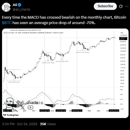 Индикатор MACD на месячном графике Биткойна сигнализирует о закономерности, аналогичной предыдущим моментам ослабления тренда. Исторически каждая такая ситуация приводила к снижению от 60 до 80%. Однако эти события произошли после окончания бычьего рынка и были подтверждением изменения направления, а не предостережением против него.