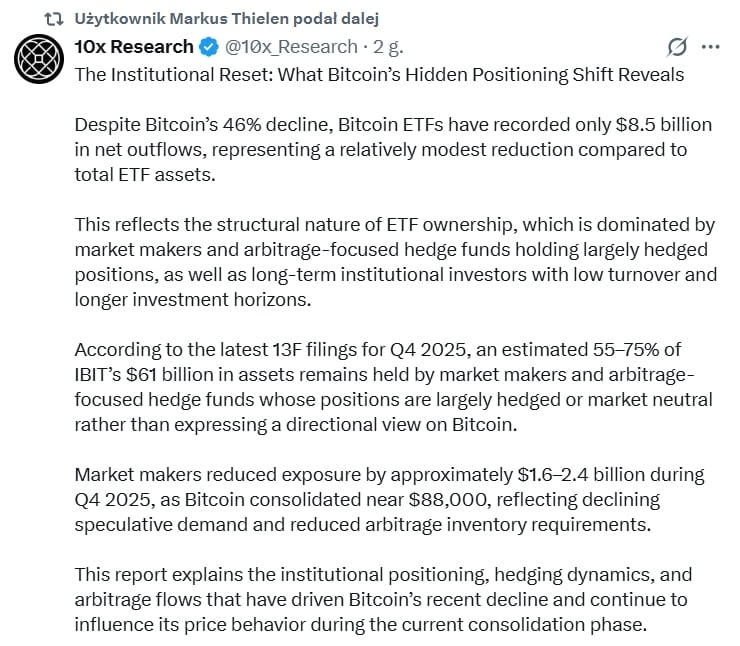 Маркус Тилен отмечает, что в четвертом квартале прошлого года, когда биткойн колебался в районе $88 000, маркет-мейкеры начали немного сокращать свои риски на суммы от $1,6 до $2,4 млрд. Этот шаг отразил падение спекулятивного спроса и снижение спроса на инвентарь, необходимый для проведения арбитражных операций, что является предупреждающим сигналом для рынка. На X аналитики часто спорят о том, является ли нынешняя стабильность ETF просто затишьем перед бурей, если хедж-фонды обнаружат, что затраты на поддержание арбитражных позиций становятся слишком высокими по сравнению с потенциальной прибылью. Джеймс Сейффарт из Bloomberg утверждает, что пока существует структурный спрос на регулируемые инструменты, этот капитал, вероятно, останется внутри системы, но его присутствие не порождает давления со стороны спроса, которое могло бы инициировать резкий возврат к восходящему тренду.