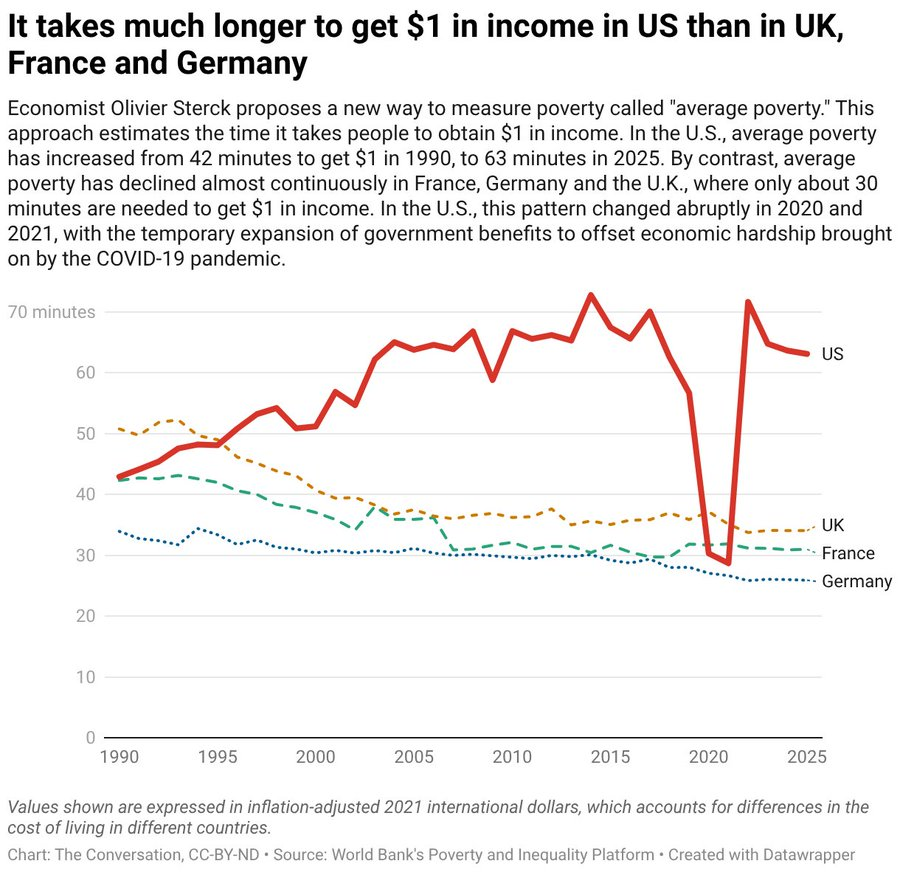В глобальном масштабе ситуация выглядит лучше. С 1990 года предварительно определенный уровень «средней бедности» снизился на 55%. Время, необходимое для зарабатывания доллара, сократилось с половины дня до примерно пяти часов. Но пример США показывает, что одного только экономического роста недостаточно. Потому что вы можете быть богатой страной… и в то же время все более бедным обществом.