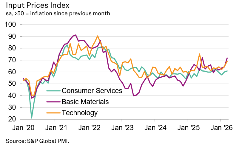 В ответ компании все чаще перекладывают на клиентов более высокие затраты, повышая цены на свои услуги. Инфляция цен продаж остается выше долгосрочного среднего уровня и ускорилась до восьмимесячного максимума. Данные PMI предполагают, что потребительская инфляция может приблизиться к 4%, если текущие тенденции сохранятся.