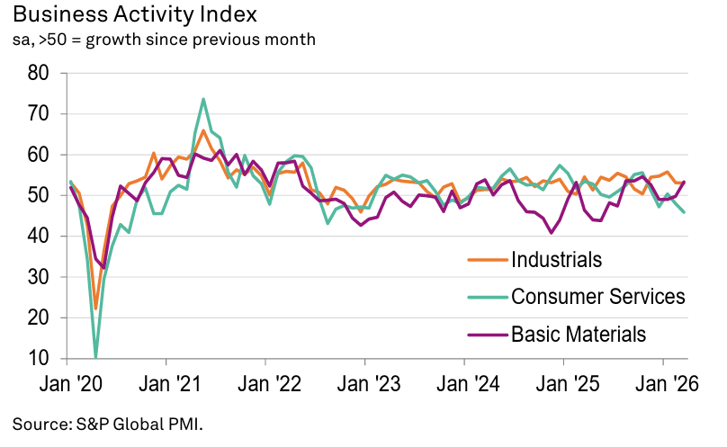 Производство потребительских товаров растет умеренно. Рост замедляется четвертый месяц подряд и достиг самых медленных темпов с сентября 2025 года. Это явный сигнал о том, что ослабление потребления начинает транслироваться не только в услуги, но и в производство товаров, хотя и с задержкой, типичной для экономического цикла.