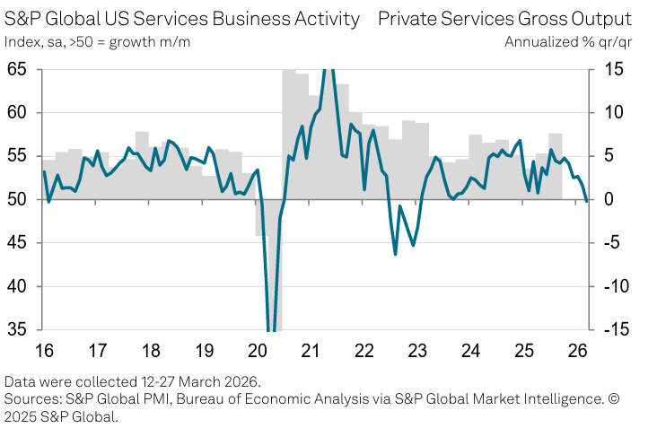 Отраслевые данные дополняют картину, складывающуюся из совокупного PMI: американская экономика не то чтобы внезапно замедляется, но явно начинает внутренне расходиться. В марте активность выросла в пяти из семи наблюдаемых секторов… Но почти во всех случаях темпы роста были ниже, чем месяцем ранее. Это означает, что даже там, где экономика все еще растет, импульс явно ослабевает.