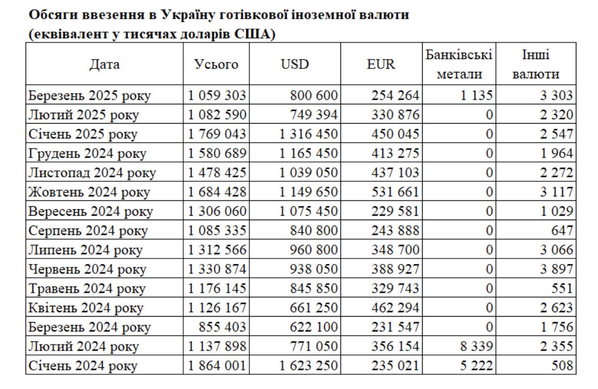 Денежные средства для иностранной валюты, доставленные в Украину в марте 2025 года, составили 1,059 миллиарда долларов. Это на 2,2% меньше, чем в феврале.
