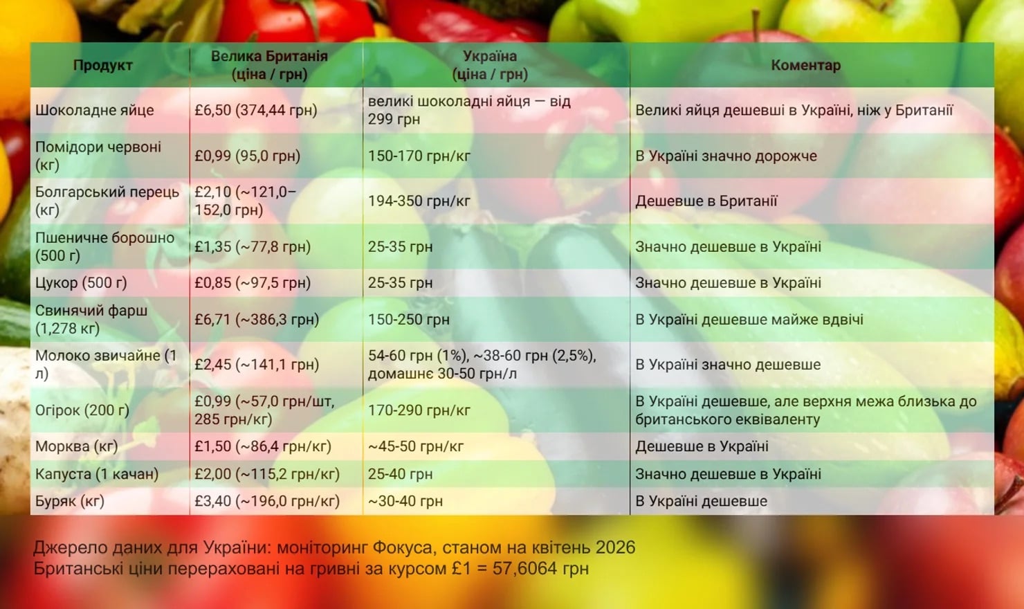 Овощи в Британии могут стоить довольно дешево: огурец (1 шт) — около 0,99 фунта (примерно 57 грн, поэтому за 1 кг получается от 190 грн), пучок зеленого лука — около 0,69 фунта (приблизительно 40 грн), помидоры черри (250 г) грн), болгарский перец (1 кг) – около 2,10 фунта (примерно 121 грн).