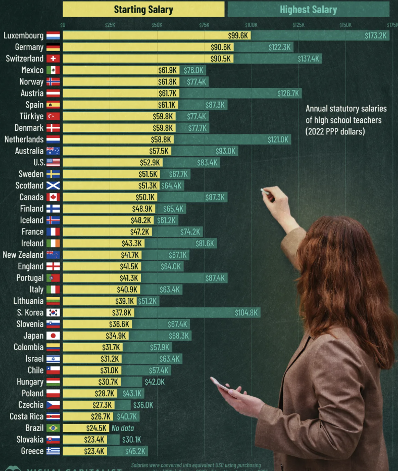 В нижней части шкалы начальные зарплаты в таких странах как Словакия, Греция и Бразилия могут опускаться ниже 30 тысяч долларов. Даже на пиковых уровнях заработки часто остаются ниже среднего показателя ОЭСР, что свидетельствует о значительных разногласиях в том, как системы образования компенсируют учителям.
