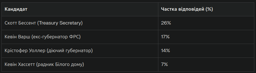 Согласно опросу, именно Скотт Бессент получил наибольшее упоминание в качестве потенциального преемника Пауэлла. Другие возможные кандидаты далеко отстают от рейтинга ожиданий, что указывает на формирование определенного консенсуса среди участников рынка.