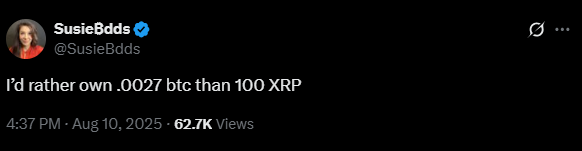 Между тем, несмотря на то, что рыночная капитализация Биткойн более чем в 12 раз больше, чем XRP, Susiebdds по -прежнему предпочитает лидера криптовалюты. Она настаивала на том, чтобы предпочла бы держать 0,0027 BTC, чем 100 XRP, которые в настоящее время стоят почти то же самое. Он предполагает, что биткойн обладает большим потенциалом роста.