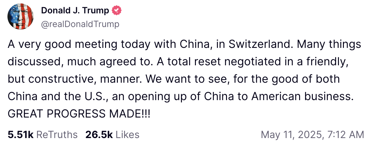 Геополитические события принесли последний импульс. Президент Дональд Трамп предложил начать переговоры с Китаем в Швейцарии, что улучшило рыночное настроение. В то же время Владимир Путин публично объявил о своей готовности поговорить с Украиной. В Южной Азии Индия и Пакистан представили прекращение огня после нескольких дней эскалации.