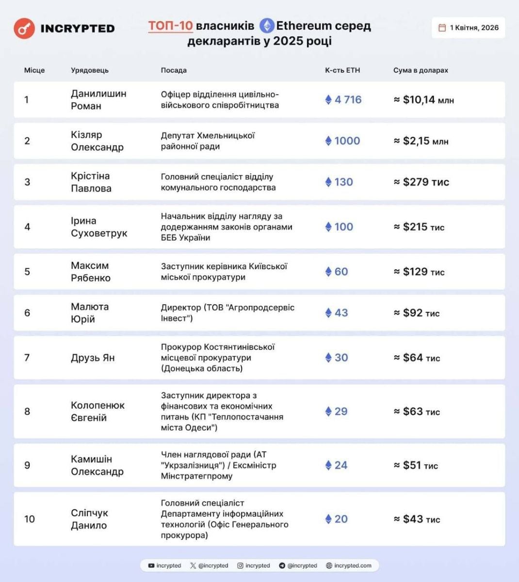 Офицер отделения гражданско-военного сотрудничества Святошинского ТЦК Роман Данилишин задекларировал 4716 ETH, что составляет около $10,14 млн. долларов или примерно 450 млн. грн.