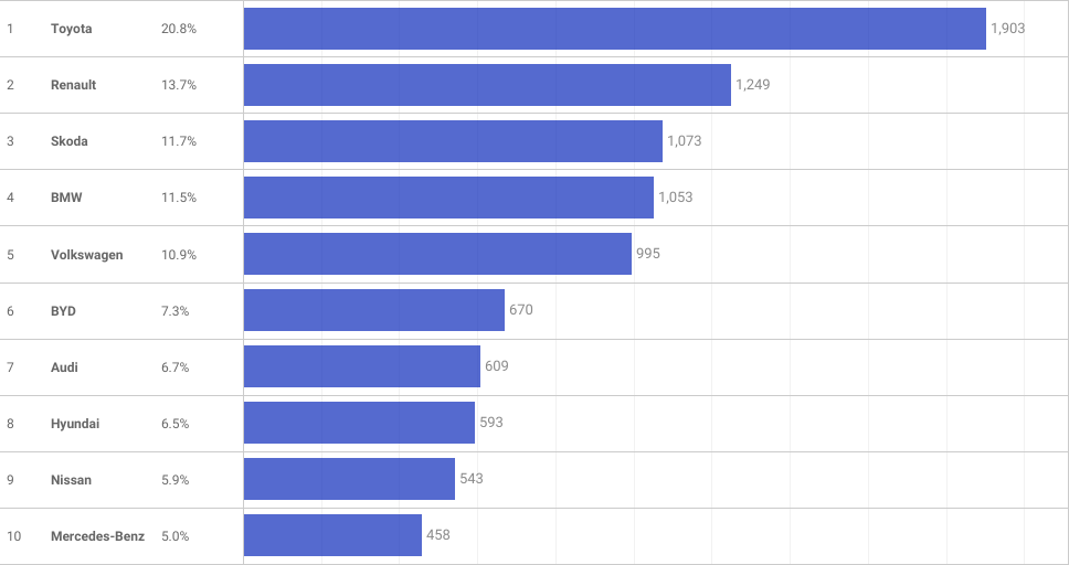 Среди брендов больше всего в первой регистрации была представлена автомобиль с эмблемы Toyota, Renault и Skoda. Вот 10 лучших производителей в результате первого квартала года: