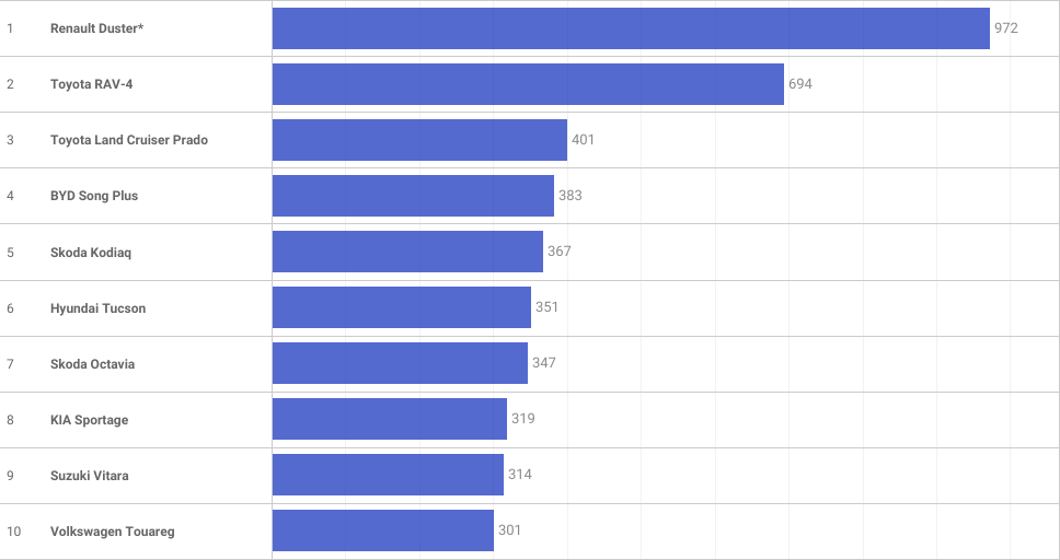 Среди отдельных моделей, как и в прошлом году, чаще всего автосалоны покидали Renault Duster и Toyota Rav4. Разница в количестве между следующими участниками намного больше по сравнению с лидерами этого топ-10, но намного меньше между ними.