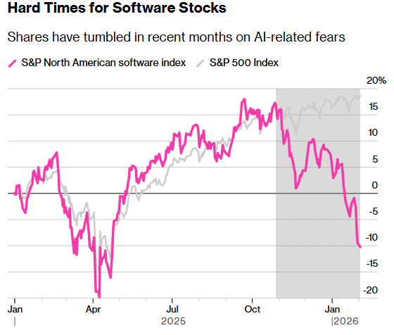 Инвесторы массово сокращают свое влияние на компании-разработчики программного обеспечения. опасаясь, что развитие искусственного интеллекта не только изменит конкурентную среду… но и подорвет основы многих моделей SaaS.. Как метко выразились аналитики из американской компании Jefferies, рынок вступил в фазу «SaaSpocalypse» — апокалипсис для программного обеспечения как услуги… В которой торговля сводится к простому сообщению: продай и уйди независимо от цены.