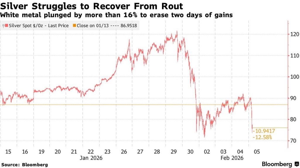 Сессия четверга в Азии привела к резкой распродаже, которая в какой-то момент почти полностью свела на нет двухдневный отскок цен. Спотовые цены на серебро временно упали на целых 17 процентов, примерно до $73 за унцию, прежде чем рынок попытался найти временную поддержку. Металл уже потерял более трети своей стоимости с рекордного максимума прошлой недели, показывая степень перегрева предыдущего ралли.