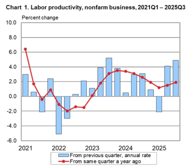 Однако настоящий сюрприз заключаются в данных о производительности. В третьем квартале 2025 года Производительность труда в несельскохозяйственном секторе выросла на целых 4,9% в годовом исчислении. Этот результат впечатляет даже самых больших скептиков на Уолл-стрит. Производство увеличилось на 5,4%, а количество отработанных часов увеличилось всего на 0,5%.
