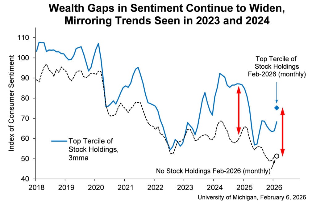 Последние данные исследования потребительских настроений Мичиганского университета показывают улучшение, которое на первый взгляд может показаться оптимистичным. Предварительный индекс потребительских настроений за февраль вырос до 57,3 пункта с 56,4 пункта в январе, превысив консенсус Bloomberg в 55 пунктов и достигнув самого высокого уровня с августа 2025 года. Однако это все еще примерно на 20% ниже уровня января 2025 года и очень мало в историческом плане.