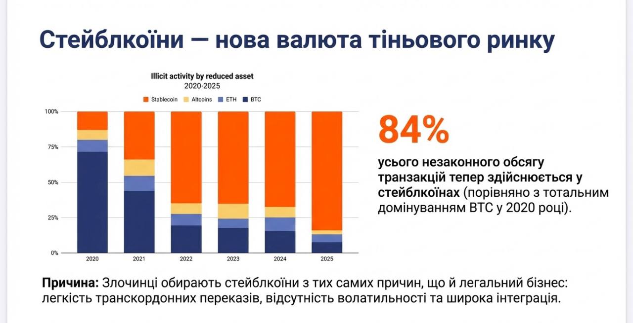 В 2025 году 84% всего незаконного объема трансакций осуществлялось в стейблкоинах (по сравнению с тотальным доминированием биткоина в 2020 году). Об этом написал заместитель председателя Налогового комитета
